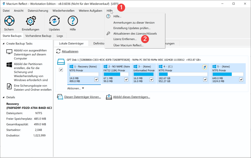 Der Hauptunterschied ist, dass sich die Macrium Reflect Home Version nur bis maximal vier PCs zentral verwalten läßt. Kurz: wenn Sie nur ein, zwei PCs sichern wollen, greifen Sie zur Home-Version, ansonsten zur Workstation.