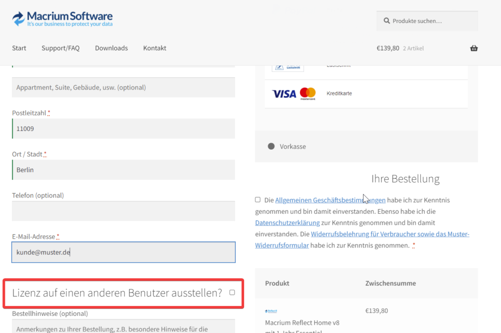 Kein Problem, klicken Sie in der Kasse diese Checkbox und tragen Sie die Daten des Lizenznehmers ein.